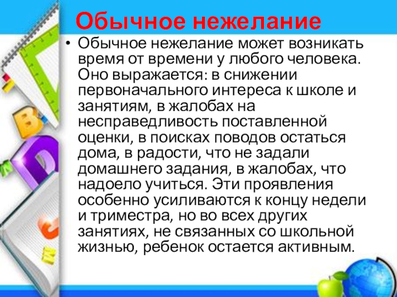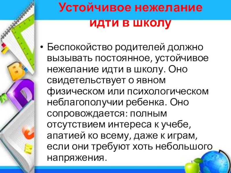 идти в школу. Оно свидетельствует о явном физическом или психологическом неблагополучии ребенка. Оно сопровождается: полным отсутствием интереса к учебе, апатией ко всему, даже к играм, если они требуют хоть небольшого напряжения.