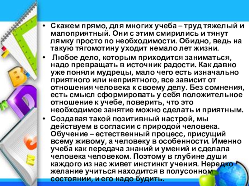 Слайд 3Скажем прямо, для многих учеба – труд тяжелый и малоприятный. Они