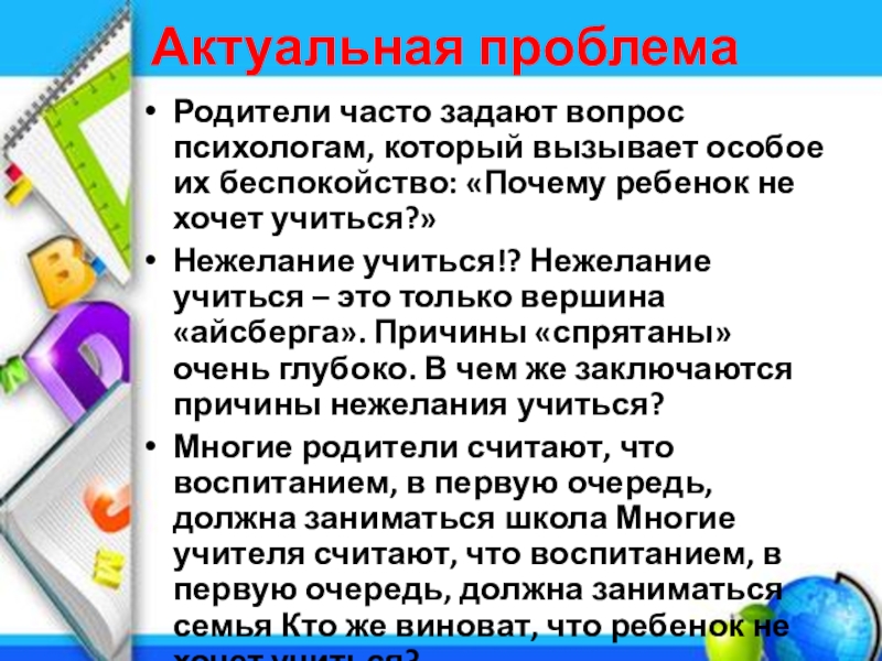 Многие родители считают, что воспитанием, в первую очередь, должна заниматься школа Многие учителя считают, что воспитанием, в первую очередь, должна заниматься семья Кто же виноват, что ребенок не хочет учиться?