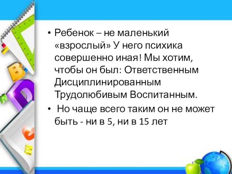 Слайд 6Ребенок – не маленький «взрослый» У него психика совершенно иная! Мы