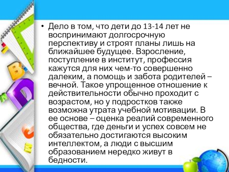 перспективу и строят планы лишь на ближайшее будущее. Взросление, поступление в институт, профессия кажутся для них чем-то совершенно далеким, а помощь и забота родителей – вечной. Такое упрощенное отношение к действительности обычно проходит с возрастом, но у подростков также возможна утрата учебной мотивации. В ее основе – оценка реалий современного общества, где деньги и успех совсем не обязательно достигаются высоким интеллектом, а люди с высшим образованием нередко живут в бедности.