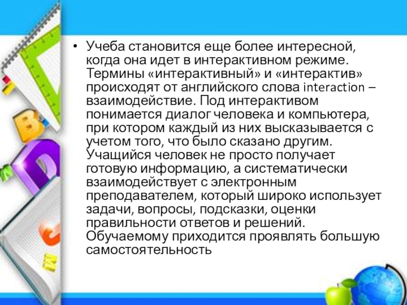 Термины «интерактивный» и «интерактив» происходят от английского слова interaction – взаимодействие. Под интерактивом понимается диалог человека и компьютера, при котором каждый из них высказывается с учетом того, что было сказано другим. Учащийся человек не просто получает готовую информацию, а систематически взаимодействует с электронным преподавателем, который широко использует задачи, вопросы, подсказки, оценки правильности ответов и решений. Обучаемому приходится проявлять большую самостоятельность