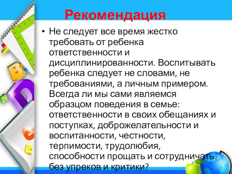 Воспитывать ребенка следует не словами, не требованиями, а личным примером. Всегда ли мы сами являемся образцом поведения в семье: ответственности в своих обещаниях и поступках, доброжелательности и воспитанности, честности, терпимости, трудолюбия, способности прощать и сотрудничать без упреков и критики?