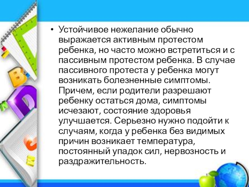 и с пассивным протестом ребенка. В случае пассивного протеста у ребенка могут возникать болезненные симптомы. Причем, если родители разрешают ребенку остаться дома, симптомы исчезают, состояние здоровья улучшается. Серьезно нужно подойти к случаям, когда у ребенка без видимых причин возникает температура, постоянный упадок сил, нервозность и раздражительность.