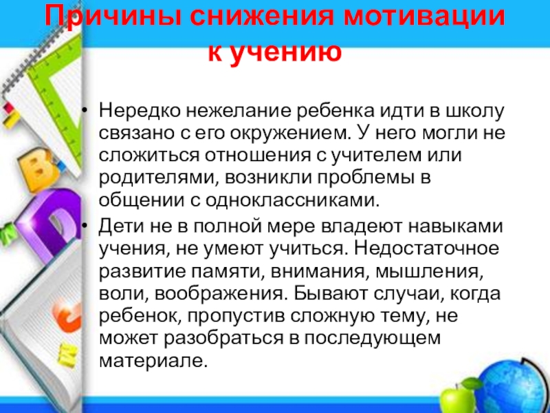 Дети не в полной мере владеют навыками учения, не умеют учиться. Недостаточное развитие памяти, внимания, мышления, воли, воображения. Бывают случаи, когда ребенок, пропустив сложную тему, не может разобраться в последующем материале.