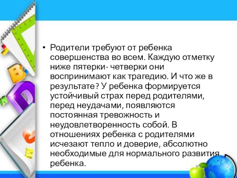 Слайд 16Родители требуют от ребенка совершенства во всем. Каждую отметку ниже пятерки-