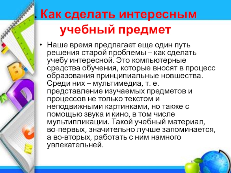 решения старой проблемы – как сделать учебу интересной. Это компьютерные средства обучения, которые вносят в процесс образования принципиальные новшества. Среди них – мультимедиа, т. е. представление изучаемых предметов и процессов не только текстом и неподвижными картинками, но также с помощью звука и кино, в том числе мультипликации. Такой учебный материал, во-первых, значительно лучше запоминается, а во-вторых, работать с ним намного увлекательней.