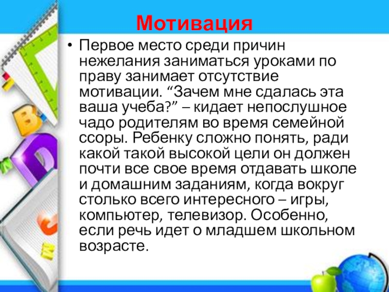 мотивации. “Зачем мне сдалась эта ваша учеба?” – кидает непослушное чадо родителям во время семейной ссоры. Ребенку сложно понять, ради какой такой высокой цели он должен почти все свое время отдавать школе и домашним заданиям, когда вокруг столько всего интересного – игры, компьютер, телевизор. Особенно, если речь идет о младшем школьном возрасте.