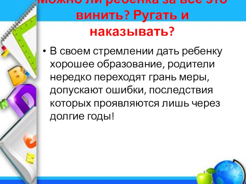 Слайд 14Можно ли ребенка за все это винить? Ругать и наказывать?
