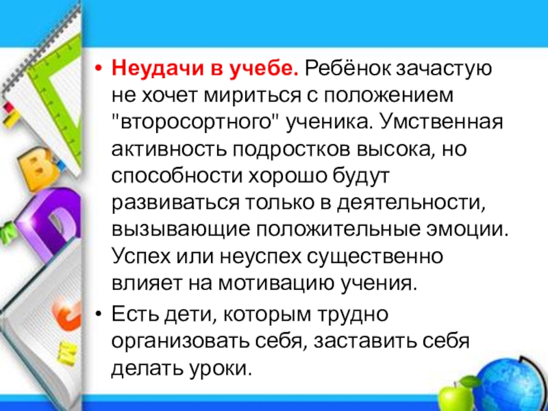 Слайд 13Неудачи в учебе. Ребёнок зачастую не хочет мириться с положением "второсортного"