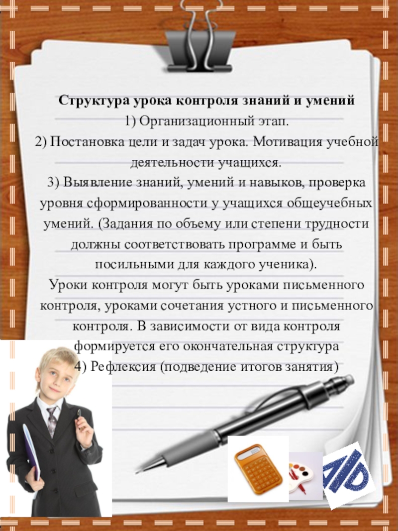 Уроки контроля могут быть уроками письменного контроля, уроками сочетания устного и письменного контроля. В зависимости от вида контроля формируется его окончательная структура