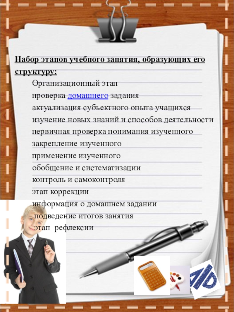 Слайд 8Набор этапов учебного занятия, образующих его структуру: