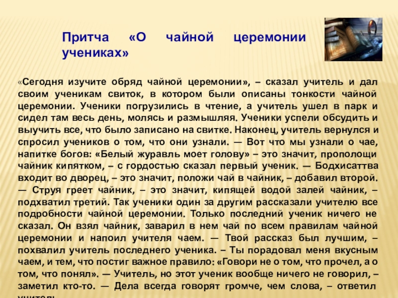 ученикам свиток, в котором были описаны тонкости чайной церемонии. Ученики погрузились в чтение, а учитель ушел в парк и сидел там весь день, молясь и размышляя. Ученики успели обсудить и выучить все, что было записано на свитке. Наконец, учитель вернулся и спросил учеников о том, что они узнали. — Вот что мы узнали о чае, напитке богов: «Белый журавль моет голову» – это значит, прополощи чайник кипятком, – с гордостью сказал первый ученик. — Бодхисаттва входит во дворец, – это значит, положи чай в чайник, – добавил второй. — Струя греет чайник, – это значит, кипящей водой залей чайник, – подхватил третий. Так ученики один за другим рассказали учителю все подробности чайной церемонии. Только последний ученик ничего не сказал. Он взял чайник, заварил в нем чай по всем правилам чайной церемонии и напоил учителя чаем. — Твой рассказ был лучшим, – похвалил учитель последнего ученика. – Ты порадовал меня вкусным чаем, и тем, что постиг важное правило: «Говори не о том, что прочел, а о том, что понял». — Учитель, но этот ученик вообще ничего не говорил, – заметил кто-то. — Дела всегда говорят громче, чем слова, – ответил учитель