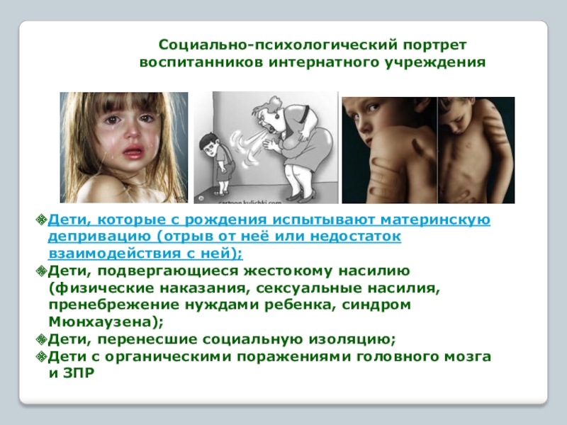 Дети, подвергающиеся жестокому насилию (физические наказания, сексуальные насилия, пренебрежение нуждами ребенка, синдром Мюнхаузена);