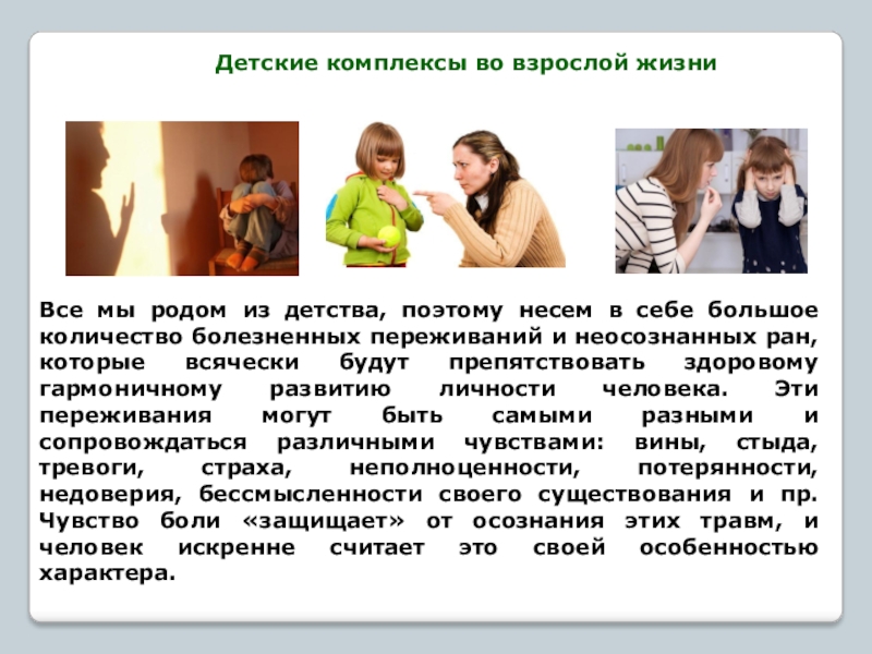 в себе большое количество болезненных переживаний и неосознанных ран, которые всячески будут препятствовать здоровому гармоничному развитию личности человека. Эти переживания могут быть самыми разными и сопровождаться различными чувствами: вины, стыда, тревоги, страха, неполноценности, потерянности, недоверия, бессмысленности своего существования и пр. Чувство боли «защищает» от осознания этих травм, и человек искренне считает это своей особенностью характера.