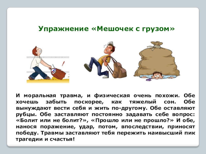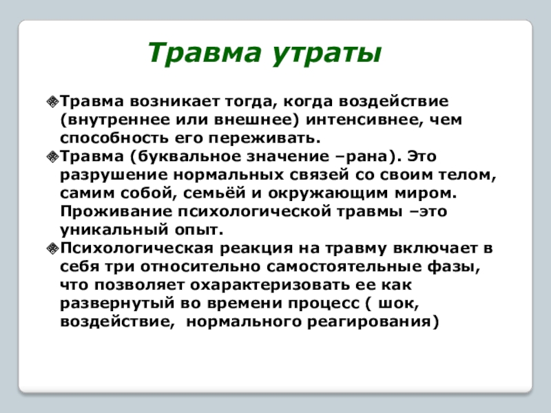 Травма (буквальное значение –рана). Это разрушение нормальных связей со своим телом, самим собой, семьёй и окружающим миром. Проживание психологической травмы –это уникальный опыт.
