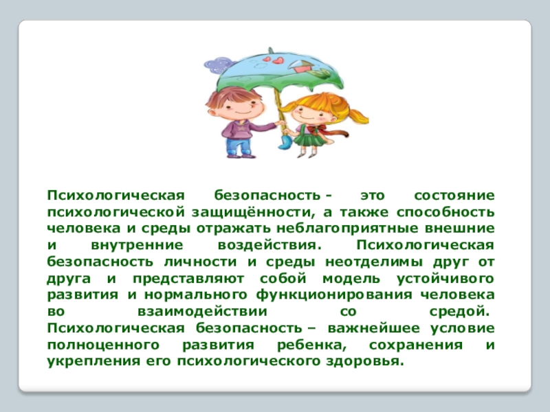 Психологическая безопасность – важнейшее условие полноценного развития ребенка, сохранения и укрепления его психологического здоровья.
