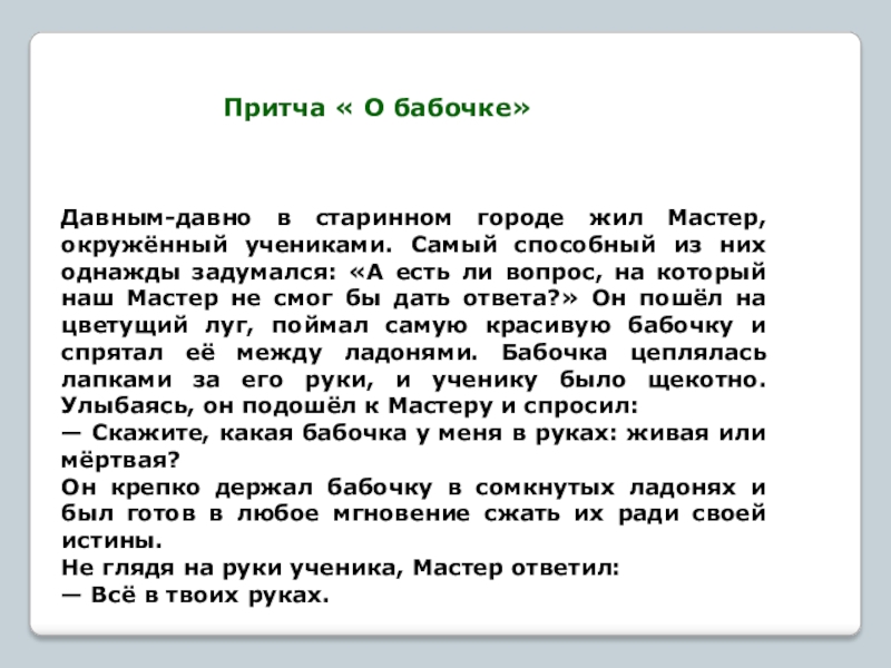 учениками. Самый способный из них однажды задумался: «А есть ли вопрос, на который наш Мастер не смог бы дать ответа?» Он пошёл на цветущий луг, поймал самую красивую бабочку и спрятал её между ладонями. Бабочка цеплялась лапками за его руки, и ученику было щекотно. Улыбаясь, он подошёл к Мастеру и спросил: