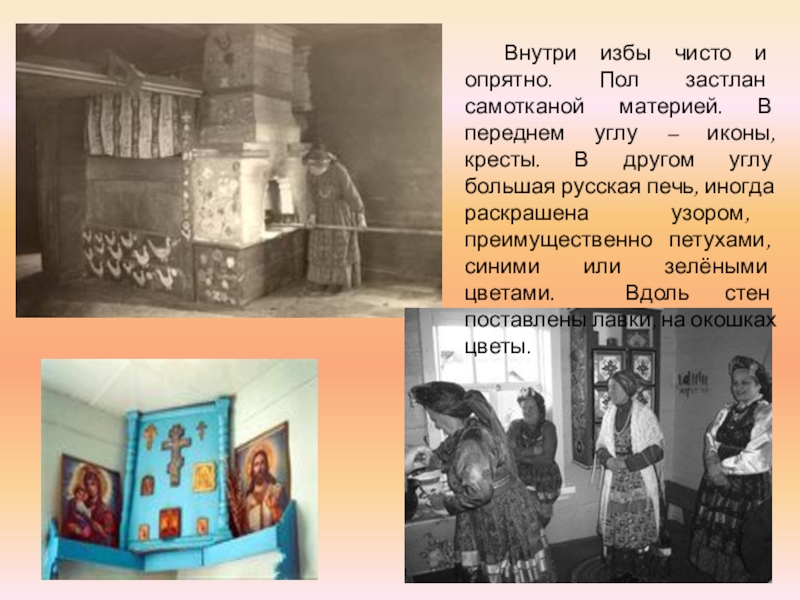 Слайд 16 Внутри избы чисто и опрятно. Пол застлан самотканой материей. В переднем