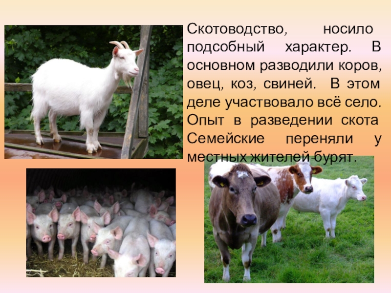 Слайд 9Скотоводство, носило подсобный характер. В основном разводили коров, овец, коз, свиней.