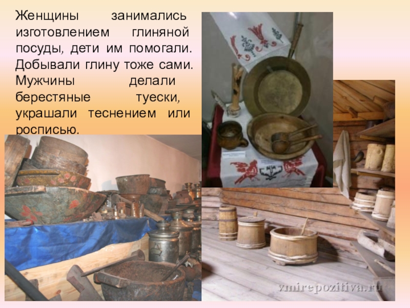Слайд 13Женщины занимались изготовлением глиняной посуды, дети им помогали. Добывали глину тоже