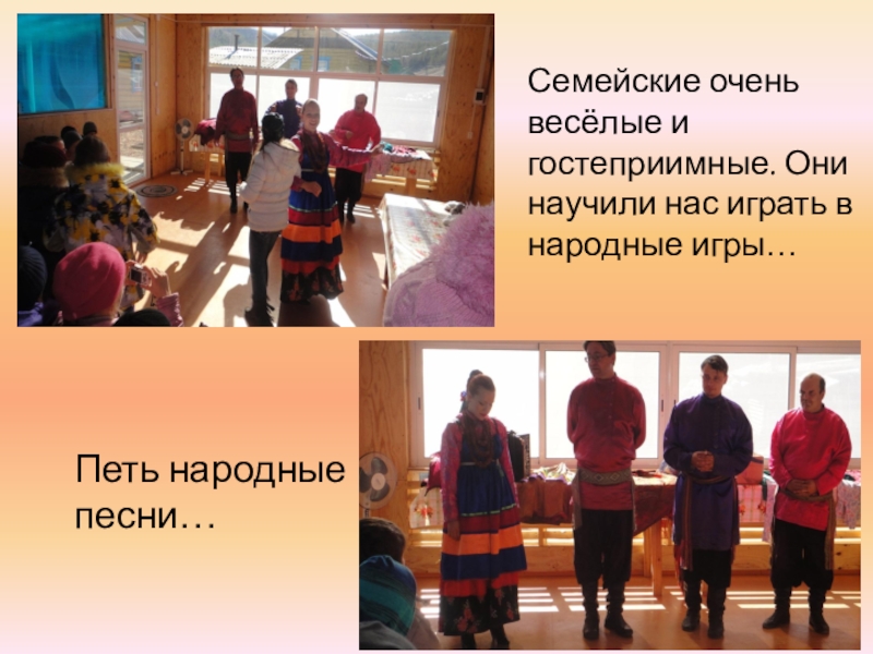 Слайд 24Семейские очень весёлые и гостеприимные. Они научили нас играть в народные