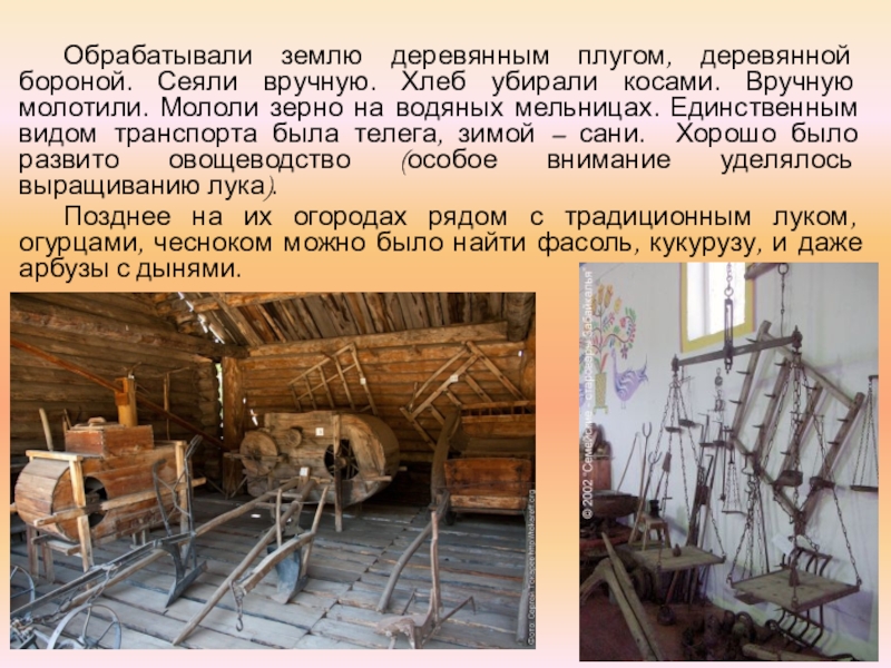 Обрабатывали землю деревянным плугом, деревянной бороной. Сеяли вручную. Хлеб убирали косами.