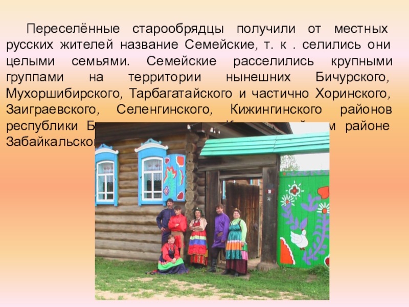 Слайд 6 Переселённые старообрядцы получили от местных русских жителей название Семейские, т. к