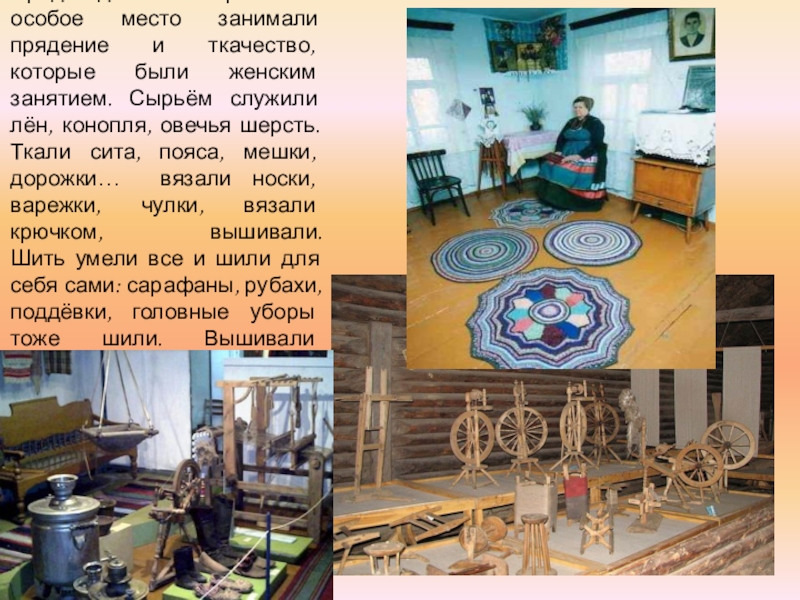 Слайд 10Среди домашних ремёсел особое место занимали прядение и ткачество, которые были