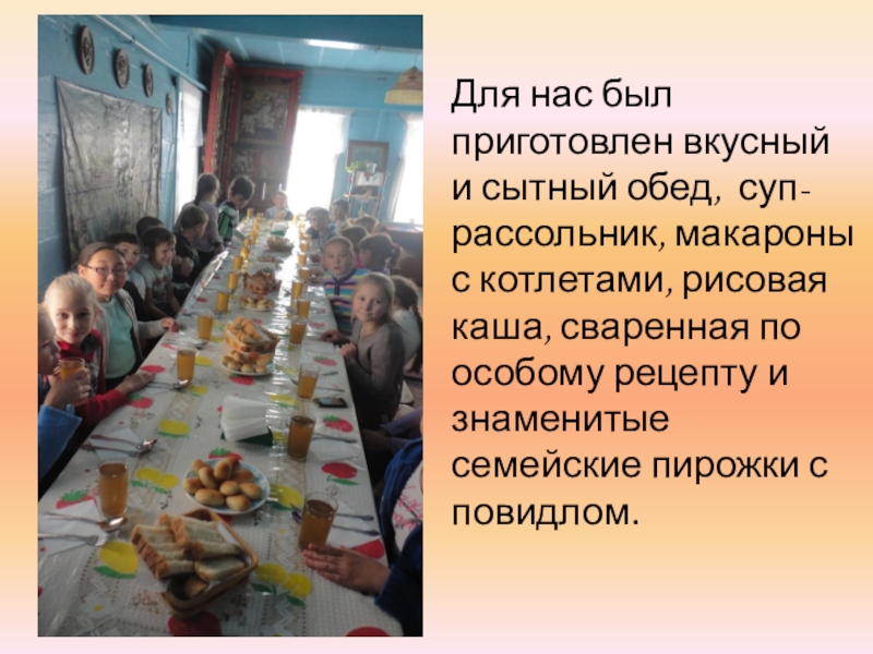 Слайд 25Для нас был приготовлен вкусный и сытный обед, суп-рассольник, макароны с