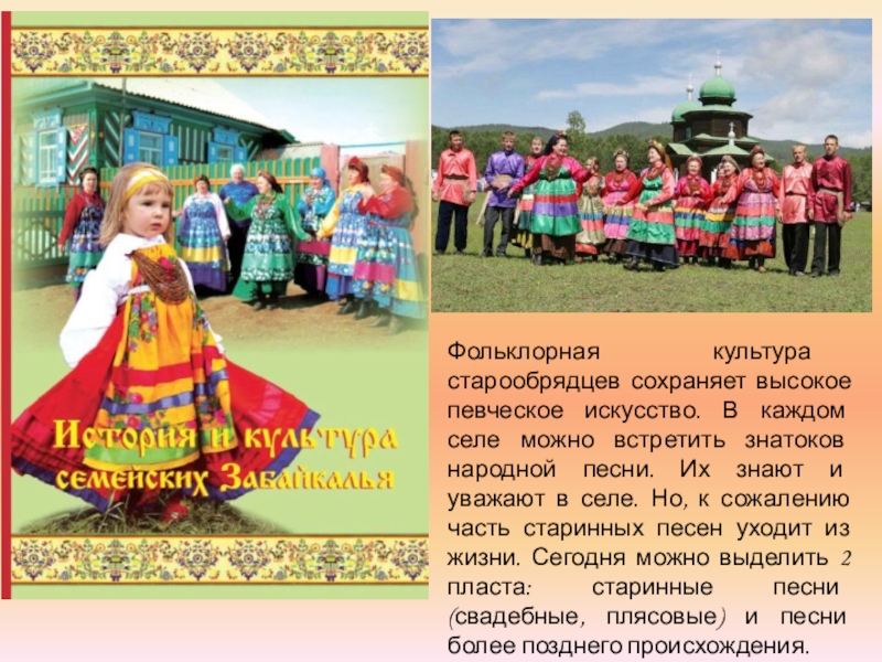 Слайд 29Фольклорная культура старообрядцев сохраняет высокое певческое искусство. В каждом селе можно