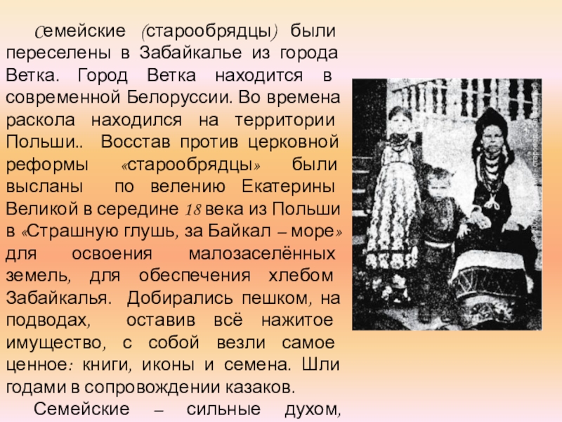 Слайд 5 Cемейские (старообрядцы) были переселены в Забайкалье из города Ветка. Город Ветка