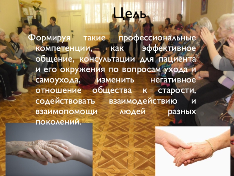 Формируя такие профессиональные компетенции, как эффективное общение, консультации для пациента и его окружения по вопросам ухода и самоухода, изменить негативное отношение общества к старости, содействовать взаимодействию и взаимопомощи людей разных поколений.