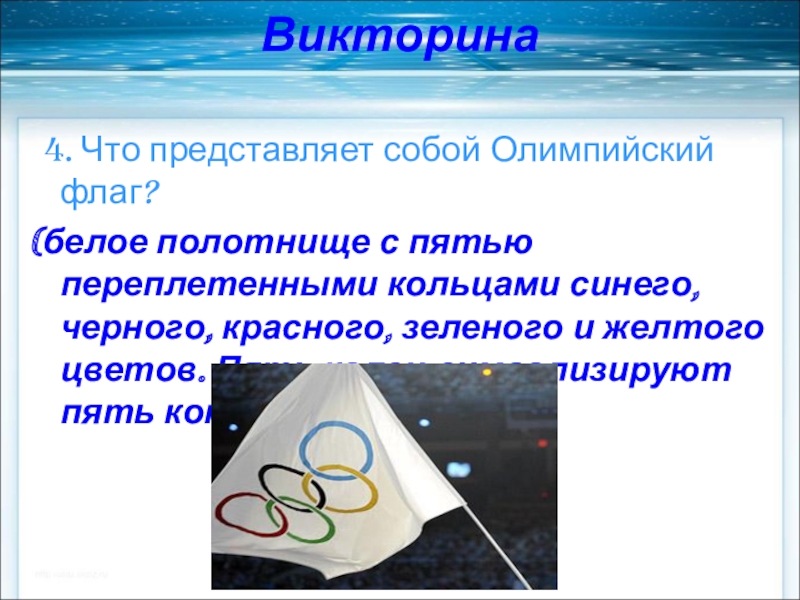 Викторина 4. Что представляет собой Олимпийский флаг? (белое полотнище с пятью переплетенными кольцами синего, черного, красного, зеленого