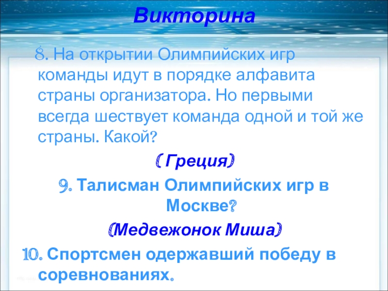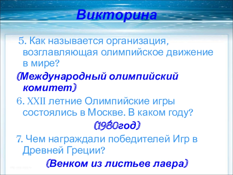 Викторина 5. Как называется организация, возглавляющая олимпийское движение в мире? (Международный олимпийский комитет) 6. XXII летние Олимпийские