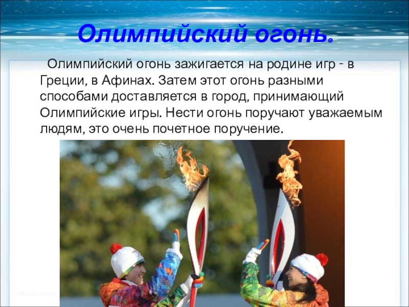 Олимпийский огонь.    Олимпийский огонь зажигается на родине игр - в Греции, в Афинах. Затем