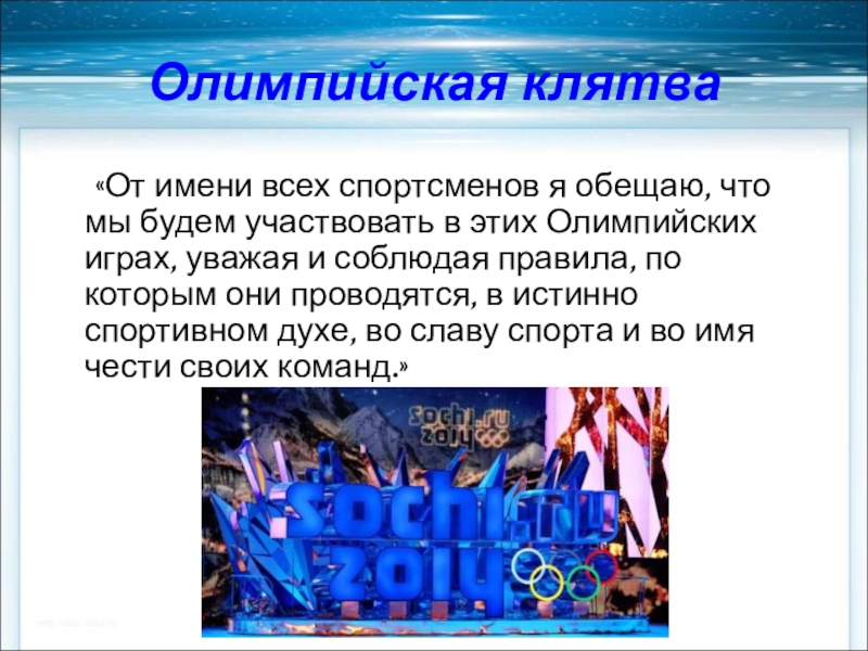 Олимпийская клятва	«От имени всех спортсменов я обещаю, что мы будем участвовать в этих Олимпийских играх, уважая и