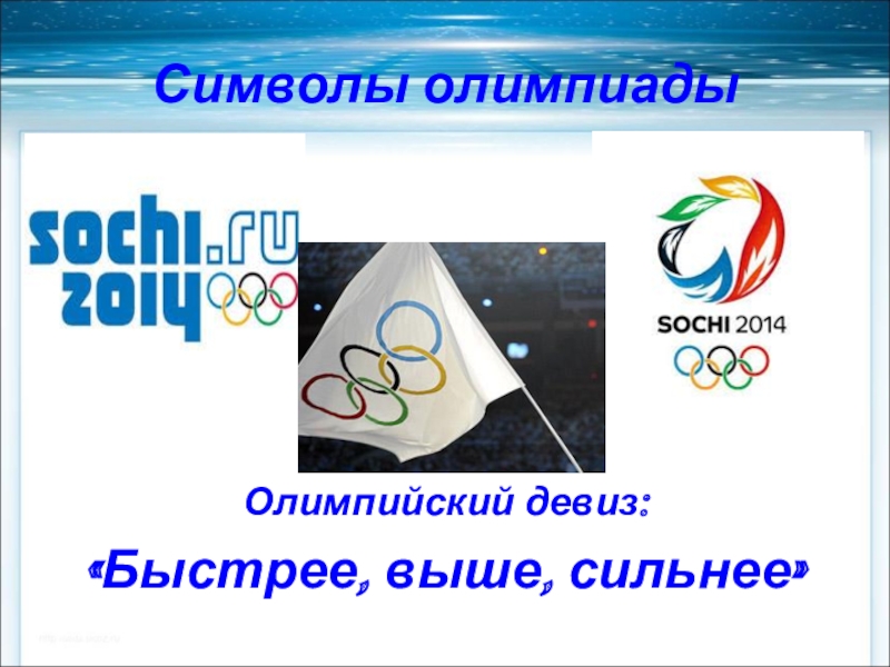 Символы олимпиадыОлимпийский девиз: «Быстрее, выше, сильнее»