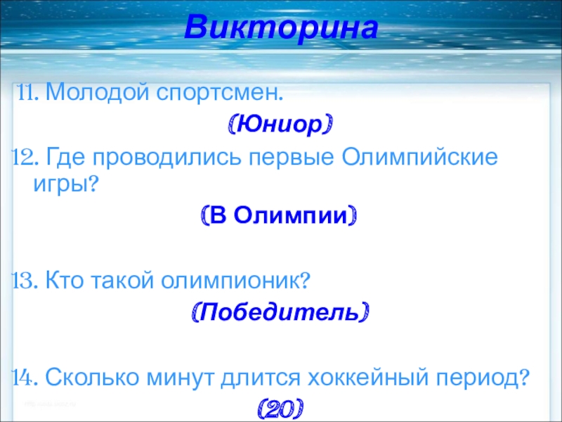 Викторина 11. Молодой спортсмен. (Юниор)12. Где проводились первые Олимпийские игры? (В Олимпии)13. Кто такой олимпионик? (Победитель)14. Сколько