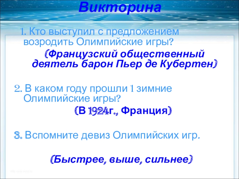 Викторина  1. Кто выступил с предложением возродить Олимпийские игры?  (Французский общественный деятель барон Пьер де