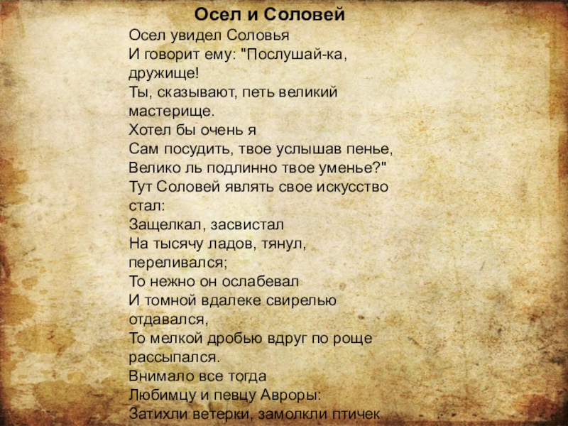 Осел и СоловейОсел увидел СоловьяИ говорит ему: