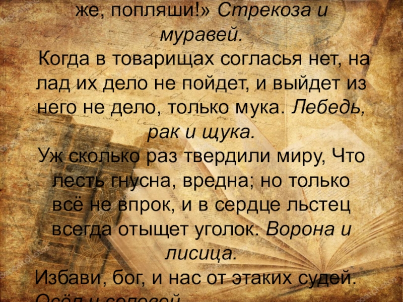 Когда в товарищах согласья нет, на лад их дело не пойдет, и выйдет из него не дело, только мука. Лебедь, рак и щука.