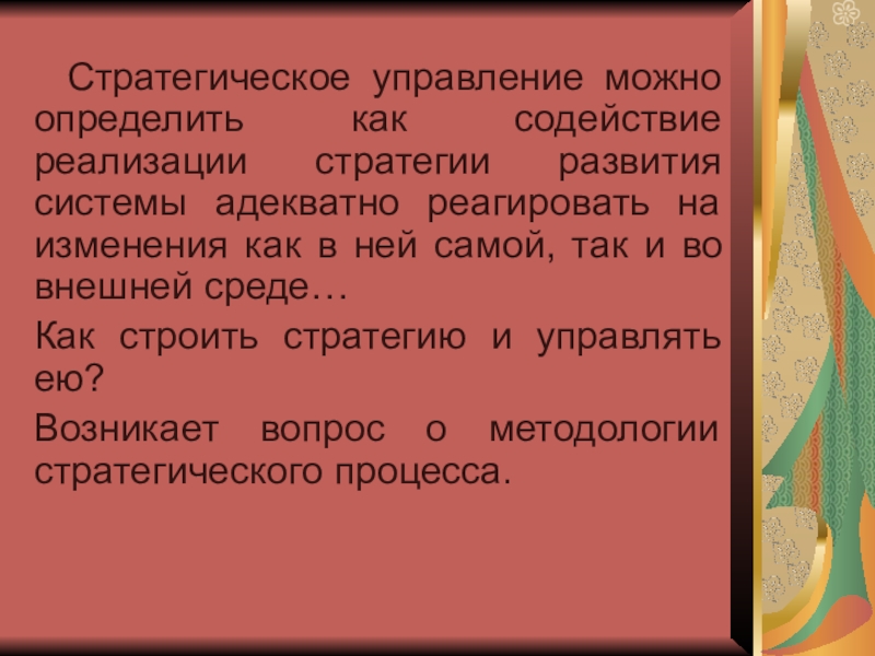 Слайд 5Стратегическое управление можно определить как содействие реализации стратегии развития системы адекватно