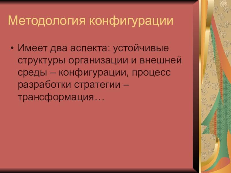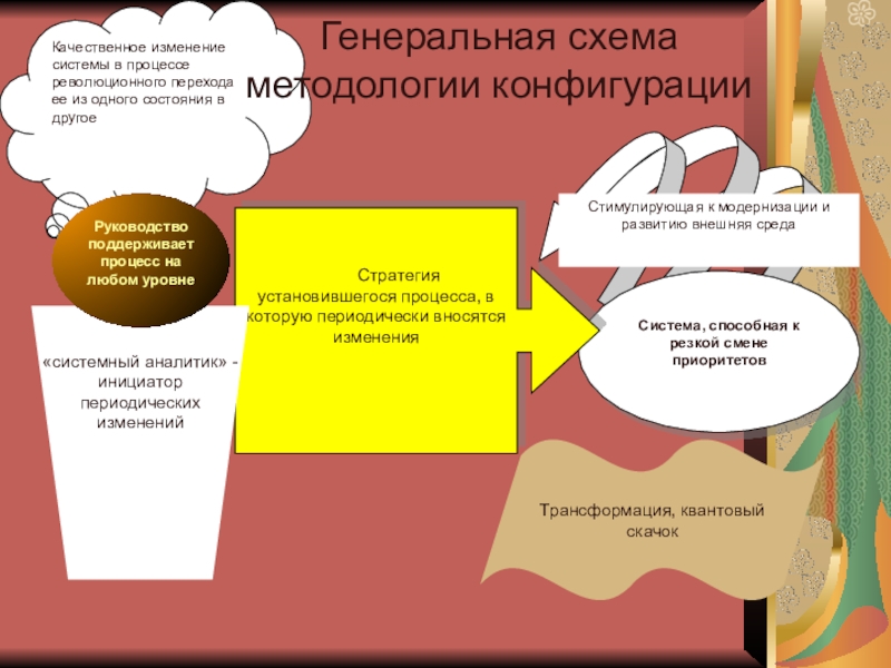 некая устойчивая конфигурация ее компонент. Определенная форма системы, адекватная определенному контексту, обуславливает поведение системы и присущую ей стратегию;