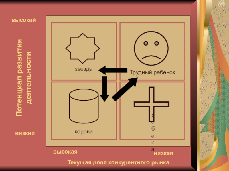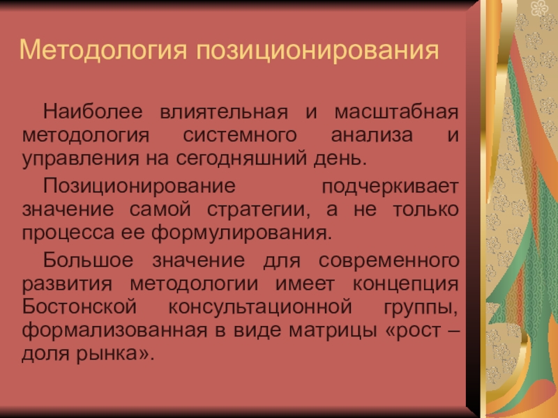 Большое значение для современного развития методологии имеет концепция Бостонской консультационной группы, формализованная в виде матрицы «рост – доля рынка».