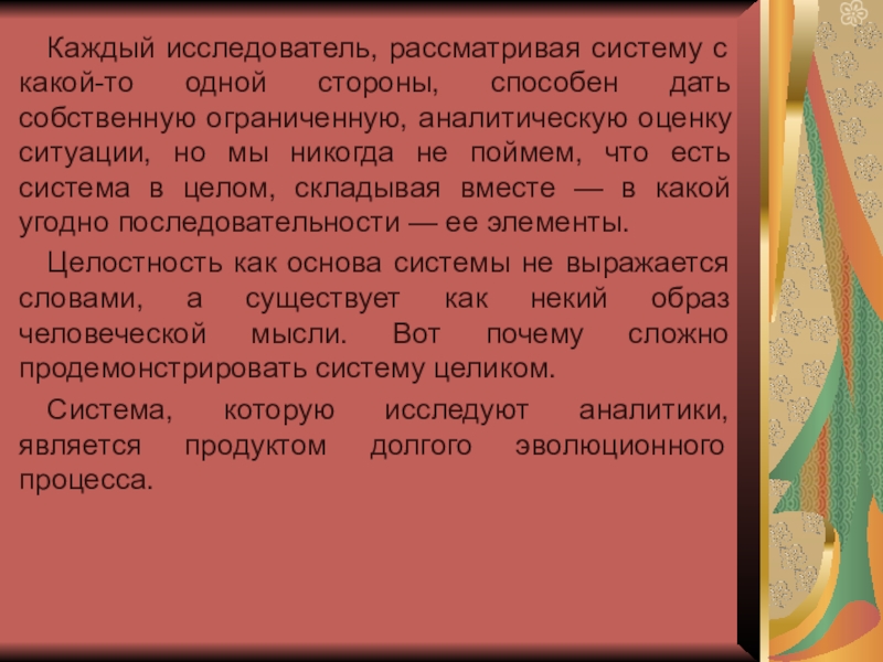 Целостность как основа системы не выражается словами, а существует как некий образ человеческой мысли. Вот почему сложно продемонстрировать систему целиком.