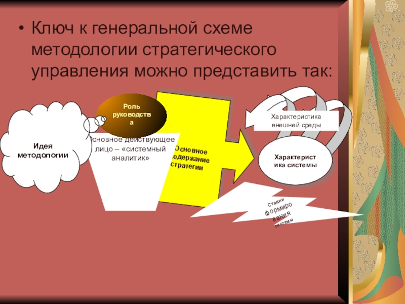 Слайд 8Ключ к генеральной схеме методологии стратегического управления можно представить так: