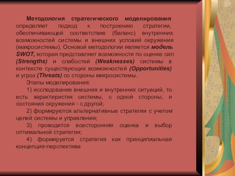 внутренних возможностей системы и внешних условий окружения (макросистемы). Основой методологии является модель SWOT, которая представляет возможности по оценке сил (Strengths) и слабостей (Weaknesses) системы в контексте существующих возможностей (Opportunities) и угроз (Threats) со стороны микросистемы.