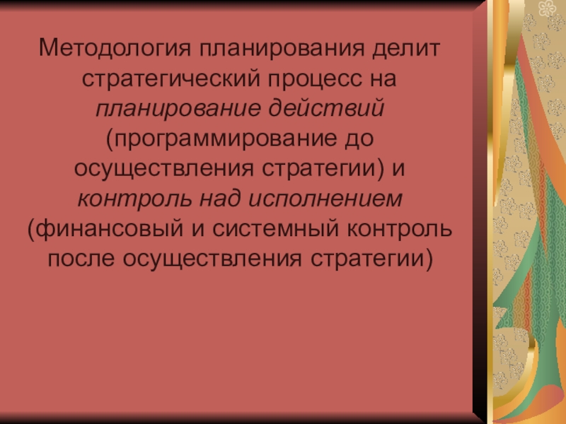 Слайд 15Методология планирования делит стратегический процесс на планирование действий (программирование до осуществления