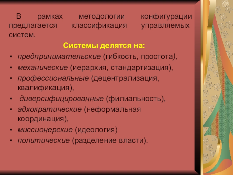 Слайд 31В рамках методологии конфигурации предлагается классификация управляемых систем.